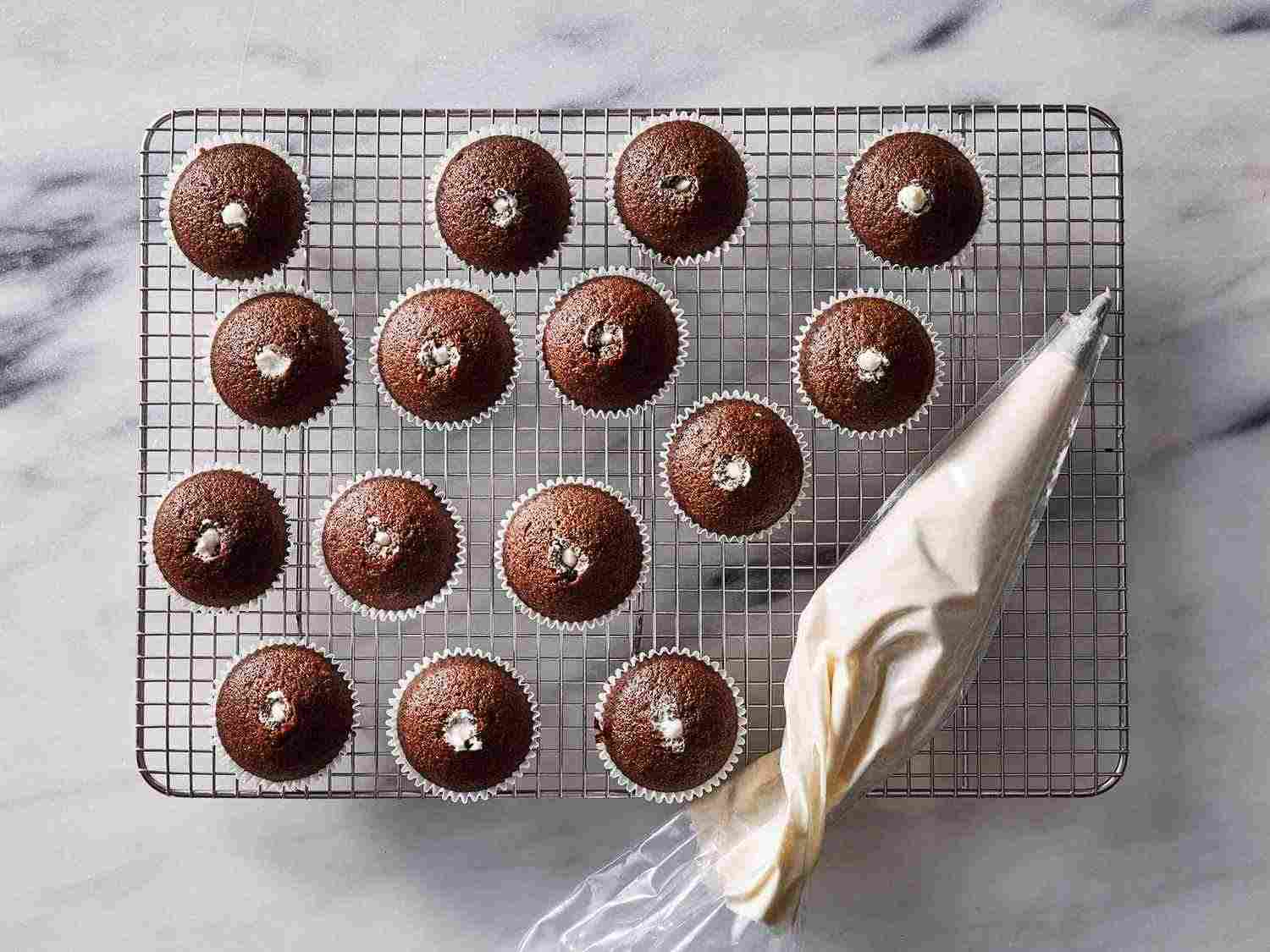 These cream-filled cupcakes are delicious and simple to make. A creamy filling is piped into chocolate cupcakes with a pastry bag. Frost with your favorite chocolate frosting.